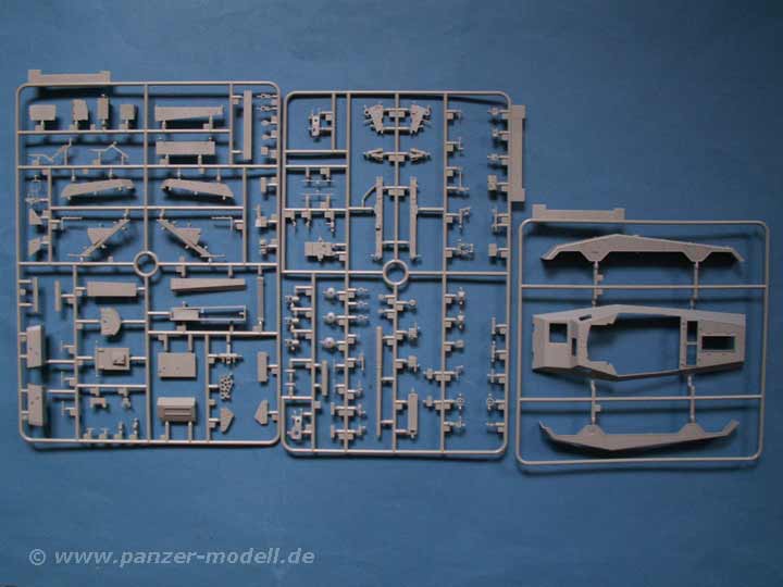 Der Bausatzkarton enthält etwa 570 Teile an 13 Spritzlingen. Das Grundmodell ist völlig neu aufgebaut worden von Dragon und entsprechend mit der schon bekannten 7,5cm PaK versehen worden. Neben den Spritzlingen erfreut uns die besagte Ober und Unterwanne, jeweils in einem Teil, sowie einem 7,5cm Alurohr, 4 Metallpeilstangen, PE Teilen, sowie Klarsichtteilen und 2 Decalbögen.
