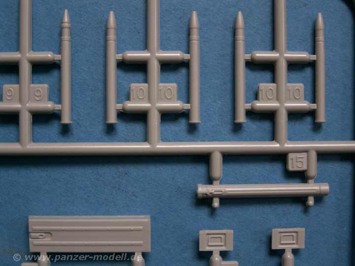 Das ganze Fahrwerk ist schön gestaltet, allerdings muss man hier für Lenkeinscglag wieder selber das Skalpell ansetzen. Der Innenraum ist hervorragend dargestellt mit beiden Fahrerplätzen und sehr schönen Details und dem entsprechenden Aufbau und Zubehör für die 7,5cm PaK. Bei der PaK ist alles enthalten, was man von den bisherigen PaK Bausätzen bereits gewohnt ist - vom Alurohr, detailierter Aufhängung und Verschluss bis zur Auswahl von 3 Mündungsbremsen - dazu ein schönes Set an Plastikmunition, Munitionskisten und Einzelverpackungen vom feinsten. Was mir persönlich aber fehlt sind passende Figuren für den Innenraum.