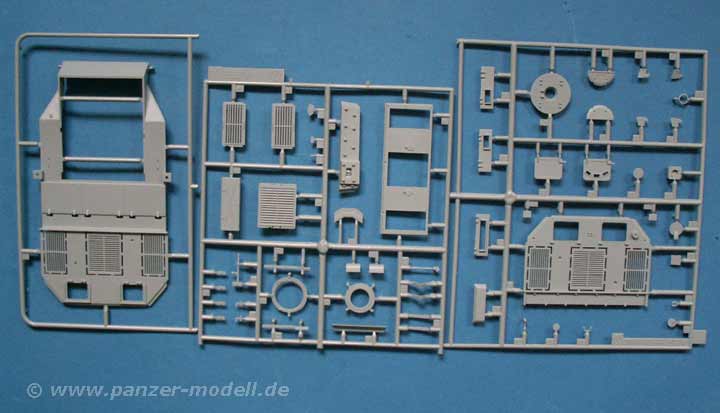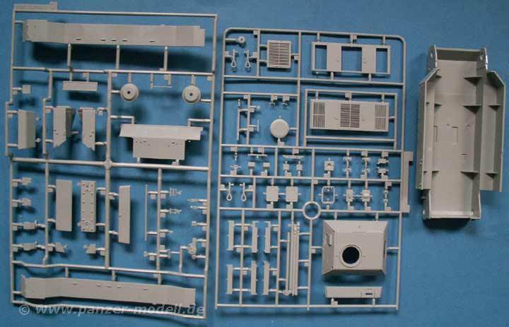 Neben den bekannten Spritzlingen für das Fahrgestell und Unterwanne sind ein paar neue Spritzlinge im Kasten, die die neue Oberwanne, Aufbau, Bergekran und Details beinhalten. Die teile sind sämtlich von guter Qualität - feine Details, Schweissnähte und sehr feine Ausführungen für einen funktionierenden Kran.