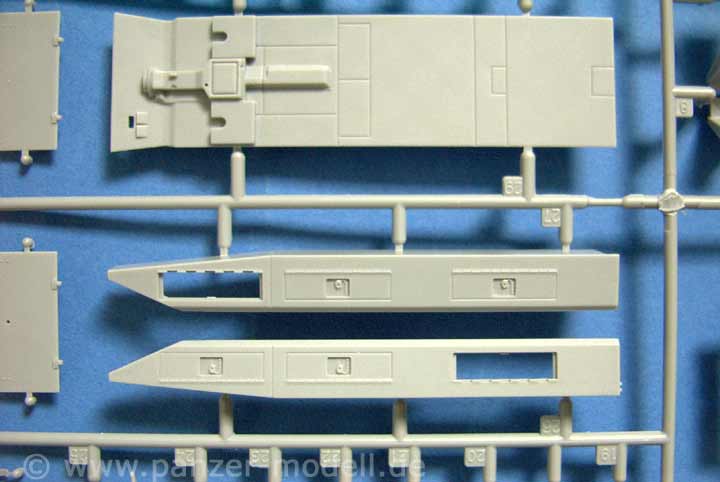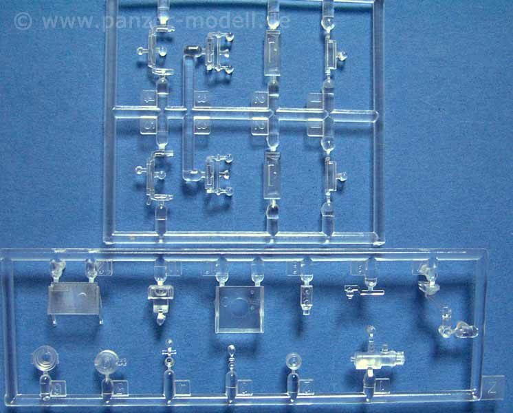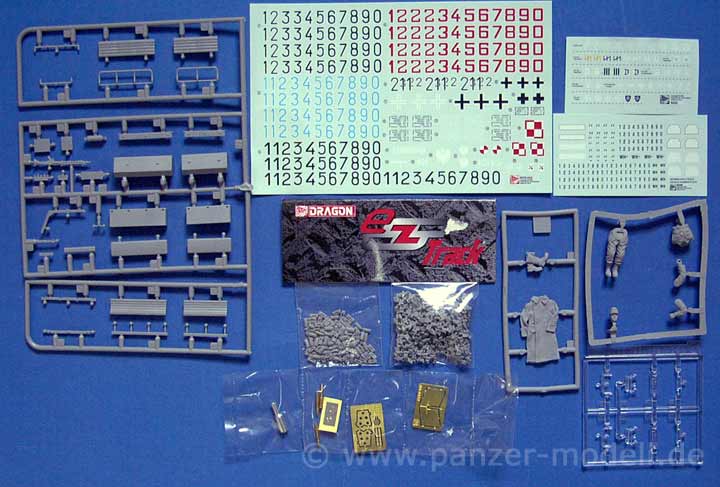 Die Detailierung der Teile ist wie in den letzten Bausätzen von Dragon sehr fein und detailiert. Sogar einige der Staukästen in den Seiten sind offengelassen um sie offen drastellen zu können. Kommen wir aber nun mal zur Zusatzausstattung, die wirklich ihresgleichen sucht! An Abziehbildern gibt es DREI Bögen - ein großer mit 4 Arten und verschiedenen Farbvarianten an Zahlen für Fahrzeugmarkierungen, ein Bogen um Nummernschilder selber zusammenzustellen und ein Bogen an je 2 Divisionsmarkierungen mit jeweils einigen Varianten der 1., 2., 3., 4., 5. und 9.SS Division, ein kleiner Satz feiner PE Teile, Kleidungsstücke in weichem Vinyl, die sehr fein detailiert sind und ein Diorama extrem aufwerten, eine Fahrerfigur, der komplette Figurensatz der "Nachtjäger", ein gedrehtes Metallrohr für die 7,5cm KwK L/24, metallgedrehte Granaten für die Stummelkanone, sowie weitere aus Plastik, haufenweise Klarsichtteile für die Infrarotausstattung und Sichtblöcke für Fahrer, sowie eine feine Einzelgliedkette die beweglich bleibt UND eine spätere Ausführung dieser beweglichen Einzelgliedkette in Plastik, aber (Trommelwirbel!) bereits fertig versäubert in Tütchen verpackt zum aufreissen und zusammenbauen! DAS nenne ich die beste Ausstattung die ich bislang in einem Bausatz gesehen habe.