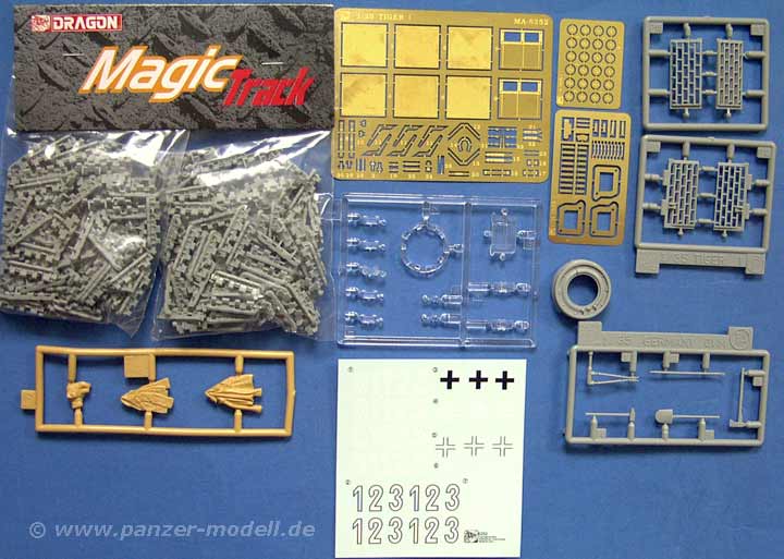 Diese Bausatz ermöglicht es, einen der allerersten Tiger der ersten Produktion darzustellen, wie er zuerst 1942 bei Leningrad bei der 502.schw.Panzerabt. zum Einsatz kam. Der Clou, den man bisher nicht oder nur extrem schwer nachbauen konnte, sind die verschiedenen Ketten für links und rechts, wie sie nur an den allerersten 20 Tigern zu finden waren.