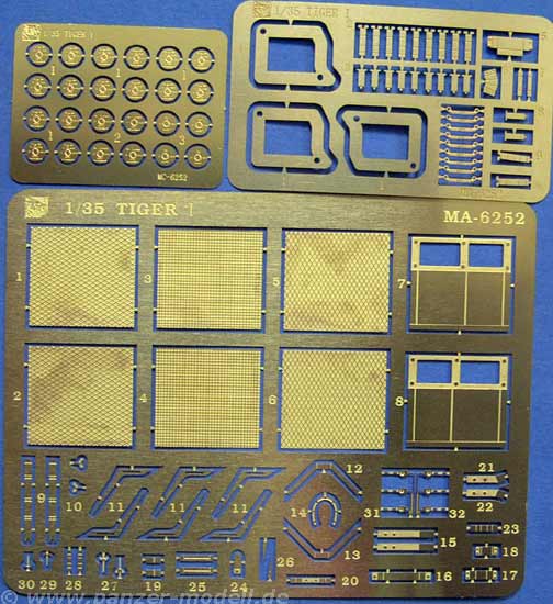 Die Bemalungsanleitung zeigt den Tiger "100" in einfach grau und Tiger "121" in zweifarbtarn weiss/feldgrau. Die Abziehbilder sehen qualitativ sehr gut aus und beinhalten drei Varianten des Balkenkreuzes, das Einheitenabzeichen der 501., den Elefanten, sowie viermal die '0', '2' und '3', sowie achtmal die '1' als weisse outline Turmnummern und zwei Sets der Zahlen 1, 2 und 3 als weisse mit schwarzem outline.