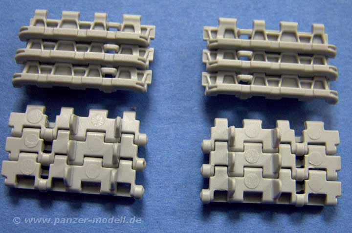 Die Ketten sind vom korrekten Typ mit links und rechts unterschiedlichen Gliedern und sind bereits vorgeschnitten und in Tüten verpackt, wie man es bereits von einigen 251er Bausätzen kennt. Einziges Manko hier sind je zwei Auswerferstellen auf der Innenseite von jedem Glied. Ärgerlich aber glücklicherweise kann man diese per Skalpell einfach abtrennen, da sie erhaben sind. Ein lästige aber machbare Arbeit. Die Ketten lassen sich sehr einfach zusammenstecken und verarbeiten und es liegen zwei Montagehilfen bei, um die richtige Biegung um leit und Treibrad zu gestalten, ohne die Kette auf das Laufwerk aufbringen zu müssen