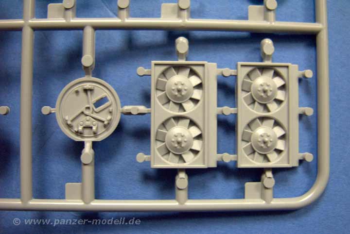 Ebenfalls sehr gut sind die Teile von Kühler und Lüfter, die in den Motorraum als Plastikteile eingebaut werden können und durch die Lüftergitter gut sichtbar sind! Ein weiterer Clou ist die Möglichkeit das Laufwerk mit funktionierender Drehstabfederung zu bauen. Schön ist eben die Möglichkeit dass der Modellbauer entscheiden kann ob er diese Option nutzen will, oder nicht, denn mit der verklebbaren Kette macht ein bewegliches Federungssystem wenig Sinn, es sei denn man hat eine bewegliche Einzelgliedkette.