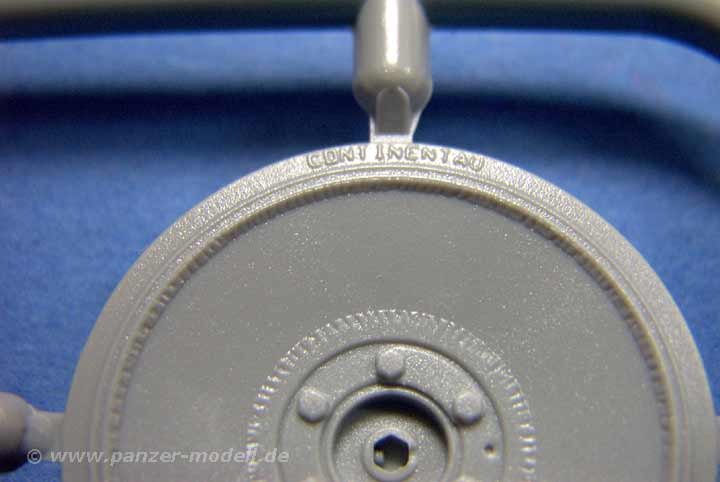 Die Laufrollen sind sehr detailiert dargestellt und zeigen auf den Gummibandagen sogar der Herstellernamen. Allerdings wurde dieser (vermutlich aus Markenrechtlichen Gründen) als "CONTINENTAU" aufgeprägt. Der gewitzte Modellbauer kratzt dann aber mit dem Skalpell einfach den rechten Schenkel des "U" weg und hat die korrekte Prägung.
