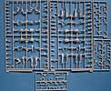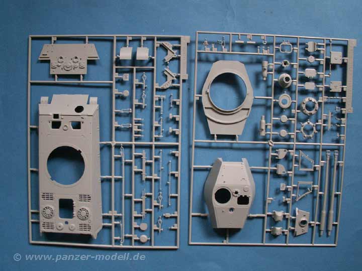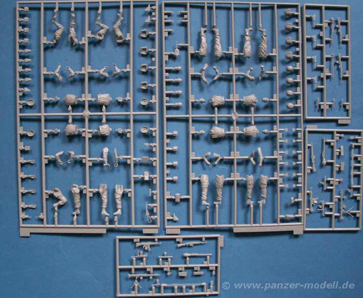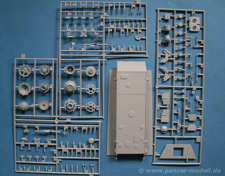 Insgesamt finden sich 659 Teile an 14 Spritzlingen, dazu PE Teile, Draht, ein gedrehtes Metallrohr, gedrehte Metallmunition, usw.