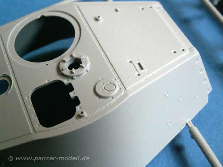 Neben dem gedrehten Metallrohr für die Kanone ist dies auch als Plastikteil enthalten. Ausserdem gibt es 3 Stück Metallmunition und die Bodenstücke der Hülsen als PE Teile. Lüftergitter sind natürlich auch als PE Teile im Bausatz dabei.