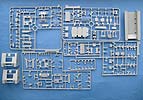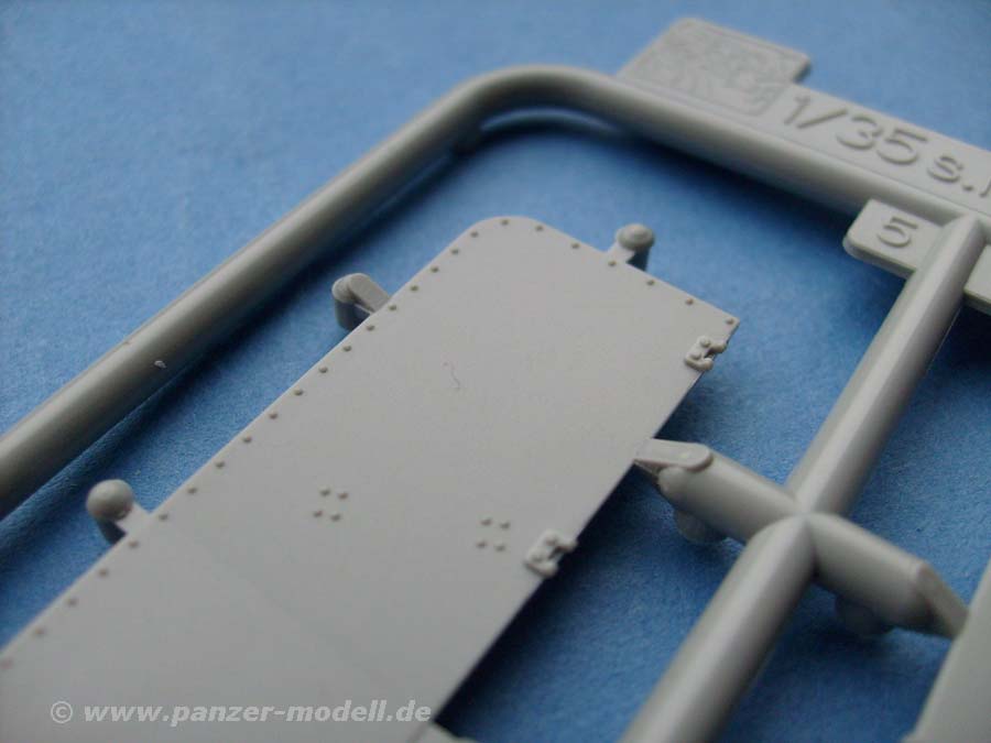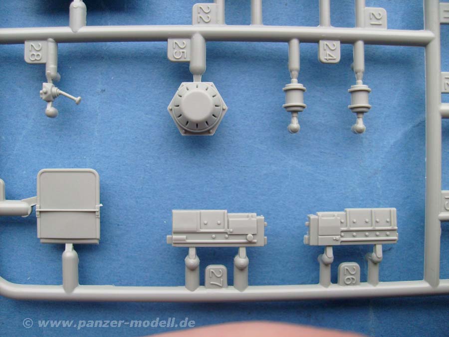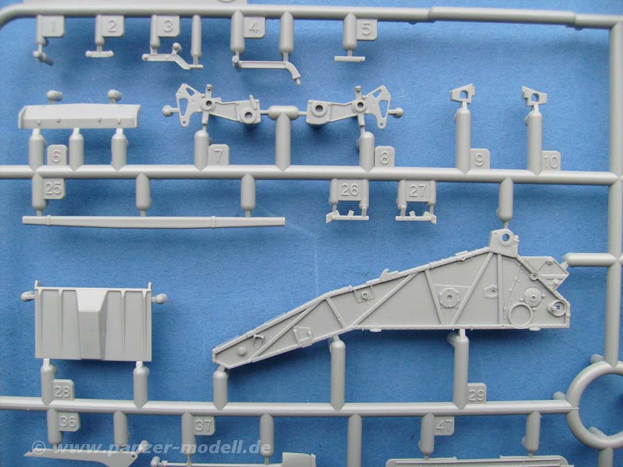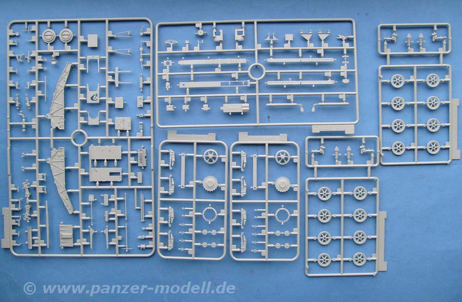 Der Bausatz besteht aus über 670 Teilen an 15 Spritzlingen. Dazu gibt es die Unterwanne, zwei Aufbauten, durchsichtige Plastikteile, PE Teile, ein gedrehtes Metallrohr, Magic Tracks Einzelgliedkette, Mun.verpackungen aus DS-Vinyl und einen Decalbogen.