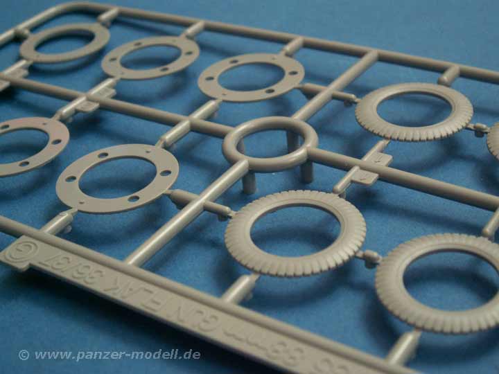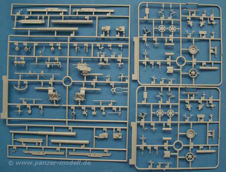 Der Bausatz besteht aus 589 Teilen an 17 Spritzlingen. Dazu gibt es PE Teile, Metallkettchen, gedrehte Metallrohre für die FlaK18 (zweiteilig) und FlaK36 (einteilig), Metallrohre für den Rohrrückholer und Höhenrichtzylinder, gedrehte Metallmunition, ein Figurenset usw.