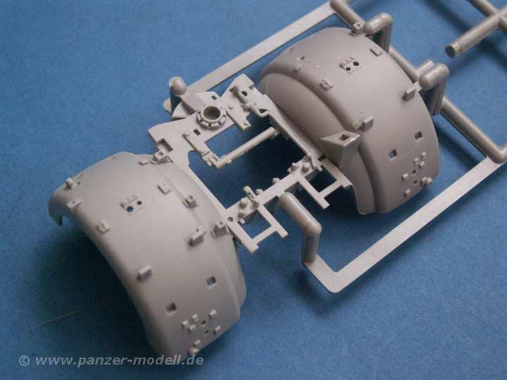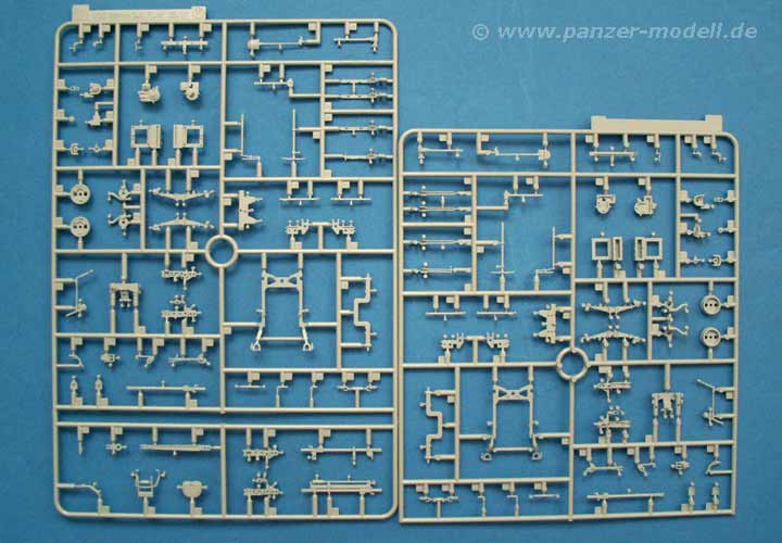 Besonders schön ist auch die Protze gelungen, deren Teile ebenfalls neue Maßstäbe setzen - angefangen von den sehr schönen Rädern mit gut gestalteten Felgen. So schöne Details wie Aufstiegshilfen, Bremsleitungen, Werkzeughalterungen, Federung, Erdnägel, usw. sind in wirklich bestechender Qualität dargestellt - dies resultiert in einer großen Menge an Kleinteilen aber auch bereits schön aufgeprägter Details auf großen Teilen. Alles in allem optisch sehr gut!