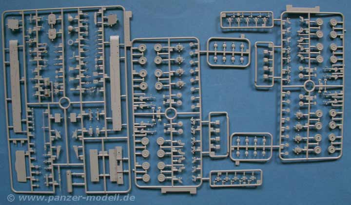 Die Qualität der samt und sonders neugestalteten Teile ist exzellent und von bislang kaum gesehenem Detailreichtum. Schön die Auswahl an zwei Unterwannen, einmal mit und einmal ohne Zusatzpanzerung an der Seite. Die Detailierung ist sogar auf der Unterseite extremst fein detailiert mit Nieten, usw. Das Laufwerk besteht aus beweglichen Aufhängungen für die Laufrollen. Die Laufrollen haben einzeln aufsteckbare Gummierungen, was die Bemalung extrem vereinfacht. Die Laufrollen weisen einen CONTINENTAU Schriftzug auf, wie man ihn vom Tiger I bereits kennt. Hier muss man sich aber kaum die Mühe machen das U in ein L umzubasteln, da der Schriftzug nur schwach erkennbar ist.
