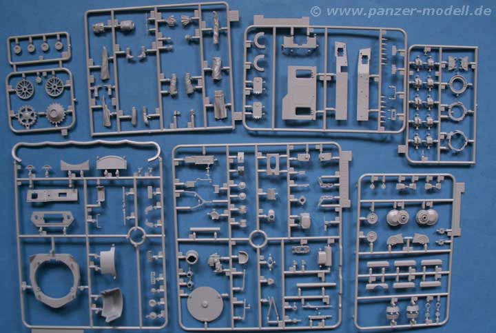 Der Bausatz besteht aus über 1000 Teilen an 18 Spritzlingen plus 2 Wannen, einen Turm, Magic Tracks (also Einzelkettenglieder bereits vorgeschnitten und in Tütchen verpackt), Klarsichtteile, Metallkabel, Metallroht, 2 Metallgranaten, vorgebogene Ätzteile und Metalldrähte, drei Platinen mit Ätzteilen, eine Generation 2 Figur eines Offiziers und als Schmanckerl für ein Afrikadiorama eine Kaktuspflanze aus Softvinyl.