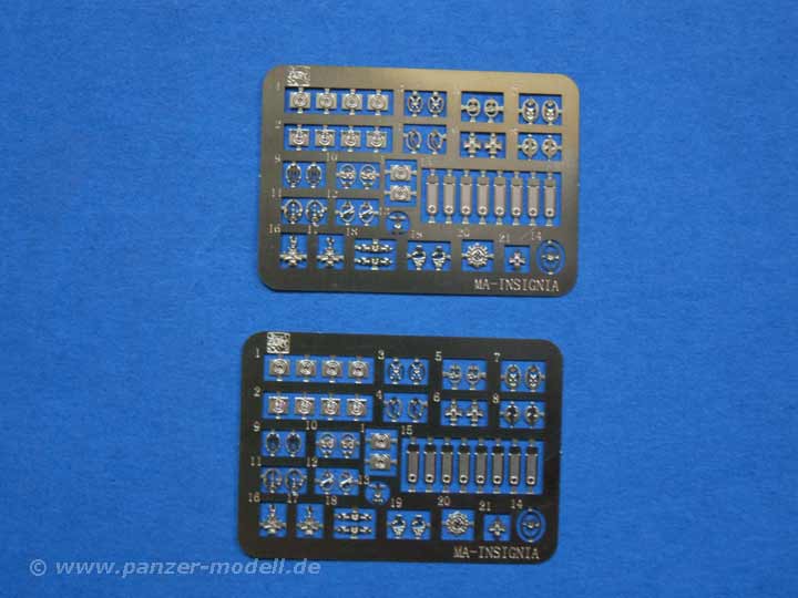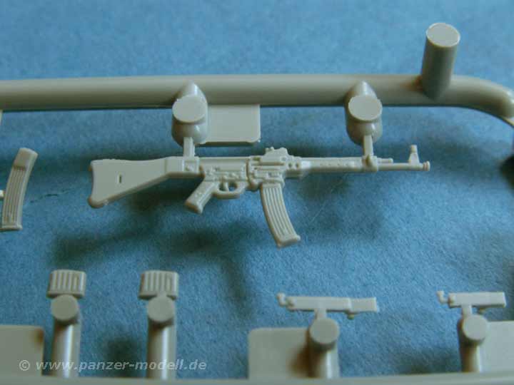 Wenden wir uns dem Zubehör zu - man könnte kurz sagen, hier ist nichts vegessen worden ... eine Unmenge der verschiedensten Waffen wie MG42, Karabiner, Sturmgewehr, MP, Handgranaten, usw. Sogar ein gut gemachter MG-Gurt aus Spritzguss liegt bei. Die Waffen und das übrige Zubehör weisen enen Detailgrad auf, wie ich es noch nie gesehen habe - offen angedeutete Mündungen, Magazine mit Feinstdetails, MG kann offen dargestellt werden, Pistolenhalfter kann offen dargestellt werden, usw. Auch beim Zubehör geht der Detailwahnsinn weiter - die Essenbehälter sind echt hohl und können offen dargestellt werden, die Trinkflaschen können vom Deckel getrennt werden, Munitions- und Magazintaschen haben superfeine Details und lassen sich auch geöffnet darstellen, usw. Und natürlich gib es auch wieder ein Setz Ätzteile für Abzeichen, Gürtelschnallen und dergleichen.