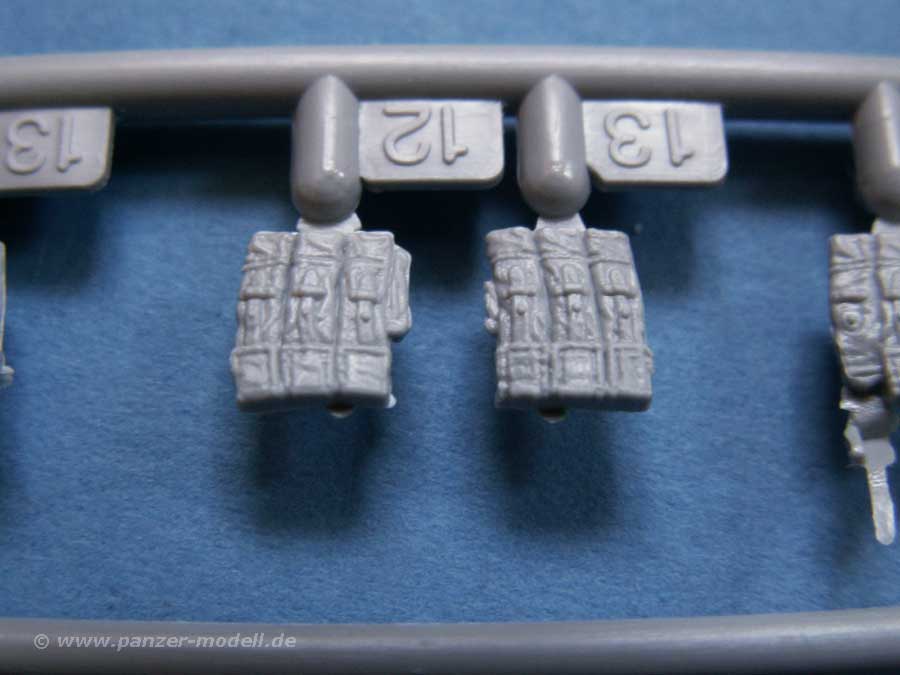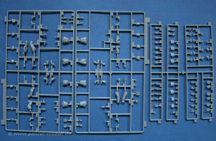 Die Gen2 Figuren bestechen durch aussergewöhnlich gute Details, sei es in der Ausrüstung, der Kleidung oder dem Gesicht - hinterschnittene Formen und echt gute 3D Effekte durch aufgesetzte Kleidungsteile machen hie wirklich eine Menge her. Dies treibt natürlich die Zahl der Einzelteile in die Höhe und steigert die modellbauerischen Ansprüche. So sind Gesichter, Hände, Füße, Kragen einzeln und müssen auf die entsprechenden Grundkörperteile noch aufgeklebt werden - die Feinheiten der Teile sind allerdings auch entsprechend fein und es bieten sich dadurch gestalterische Freiheiten, indem z.B. die Hand/Armhaltung weiter variiert werden kann. Besoders gut und aussergewöhnlich ist die Beigabe eines Kopfes mit aufgesetzter Gasmaske. Der PE Satz bietet dann noch weitere Feinheiten, wie etwa Gürtel, Schulterklappen, Sicherungsösen, Riemen, usw. Der Decalbogen biette Beschriftungen für die Waffen, Munition und Munitionskisten - selbst die feinen Bedienungs- und Gefahrenhinweise an der Panzerfaust/RaketenpzB sind enthalten.