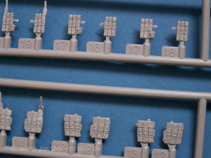 Die Ausrüstung steht diesem Detailgrad in nichts nach - Helme mit feinsten Nietendetails auf der Aussenseite, Magazintaschen, Beutel, Trinkflaschen, usw. mit feinen Riemchen und Schnallen, wie man es noch nicht gesehen hat. Dazu die spezielle Ausrüstung mit vier verschiedenen Minentypen, dem Minenprüfstab 39, und den beiden Minensuchgeräten Wien 41 und Aachen 40!
