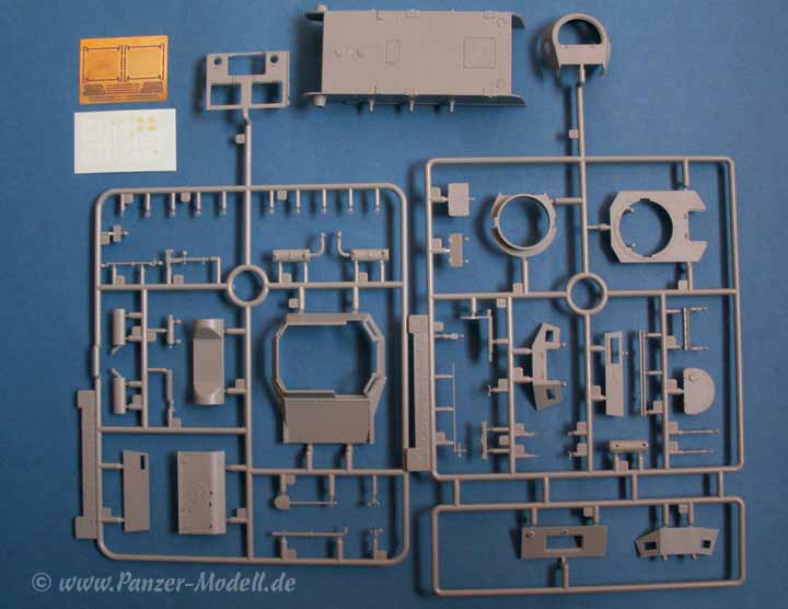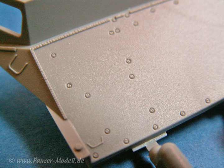 Die Qualität und Details der übrigen Bauteile, wie Wanne, Laufrollen Federschwingen, Aufbau, Turm, usw. sind hervorragend - in der Glacisplatte sind feine, versenkte Schlitzschrauben zu erkennen, di emG's habe feine Lüftungslöcher, Nieten und Schweissnähte sind überall toll dargestellt.
