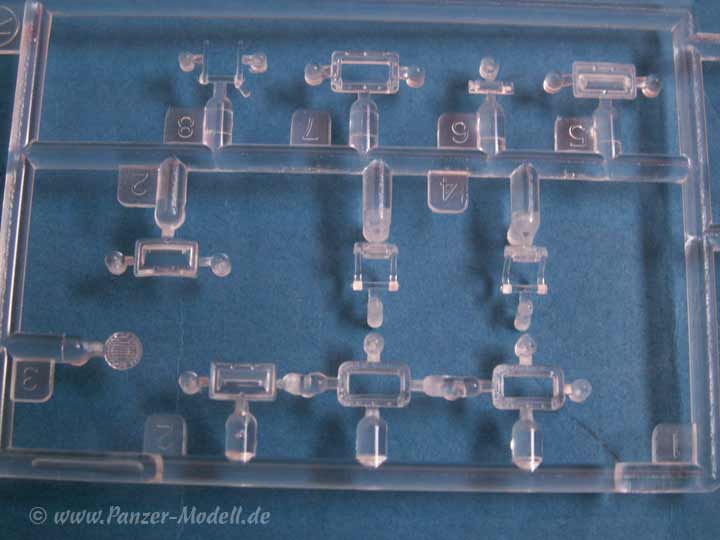 Desweiteren ist im Bausatz ein Spritzling mit Klarsichtplatik mit Teilen für Sichtblöcke, usw. Und natürlich fehlen auch nicht die PE Teile - diese umfassen hier die Auspufftopfgitter und Abluftgitter am Heck.