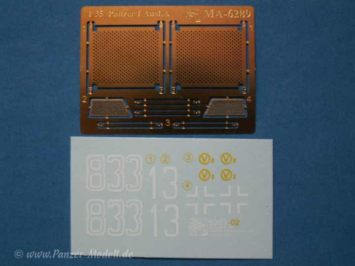 An Markierungen bietet der beigelegte Decalsatz und die Vorschläge aus der Bauanleitung ein Modell des PzRgt.5, 5.le.Div., Libyen 1941 in sandgelb, ein Modell 3./PzAbt. z.b.V.40 in Norwegen 1940 in panzergrau und ein Modell einer unbekannten Einheit in Nürnberg 1935 in Vorkriegstarnung.