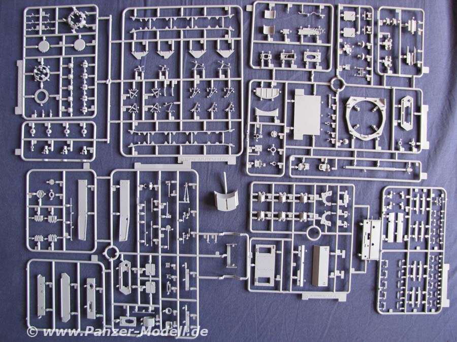 Der Bausatz umfasst über 800 Teile an über 20 verschieden großen Spritzlingen plus Unterwanne, Turm, PE Teile, vorgeschnittene Einzelgliedketten (Magic Tracks), Klarsichtteile, Metallkabel, PE Seitenschürzen und einem Decalbogen.