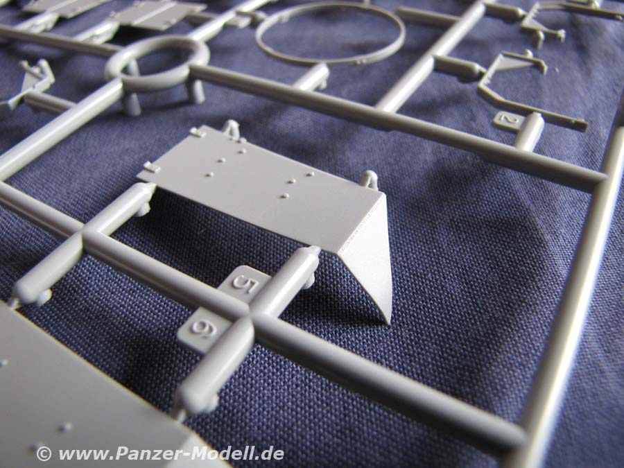 Die Halterungen für die Turmschürzen sind sauber und fein als Plastikteil dargestellt. Dies gilt auch für die Turmschürzen an sich. Die Seitlichen Luken kann man entweder als einzelnes Komplettteil geschlossen oder mit zwei Einzelteilen offen darstellen.