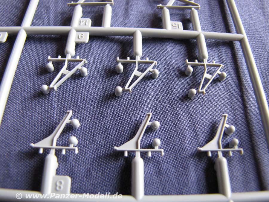 Die Qualität der Teile ist wieder mal aussergewöhnlich gut - einige Teile kennt man bereits von den vorhandenen Panzer IV Bausätzen, andere Teile sind entsprechend dieser Ausführung völlig neu. Die Detail sind sehr gut wiedergegeben, Auswerferstellen sind quasi nicht vorhanden (auf den Kettnglieder sieht man bei ganz genauem Hinsehen welche auf den Innenseiten) und es werden Teile wirklcih maßstäblich dünn in Plastik dargestellt, wie z.B. die Turmschürzen. Diese sind sogar für den hinteren Bereich als ein fertiges Teil gebogen und dünn dargestellt. Das erfreut das Auge!
