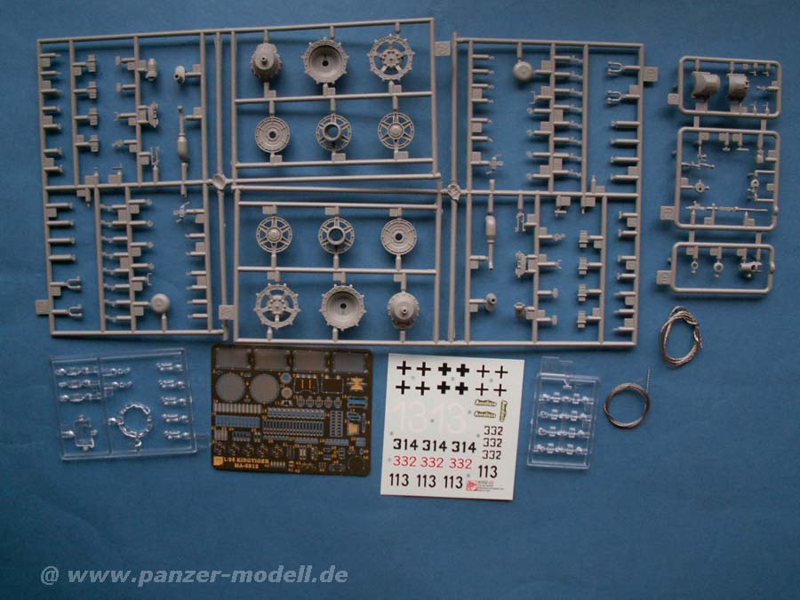 Die Zusatzausstattung ist sehr gut, seien es die Metallkabel zur Darstellung der Abschleppseile, die Lüftergitter und andere Feindetails aus Ätzteilen (z.B. Verschlüsse und Halterungen mit Feinstdetails wie Flügelmuttern), die bereits fertiggebogenen "Übergitter" für die Lüftergitter am Motordeck, die einen sonst in den Wahnsinn treiben, sowie das Metallkanonenrohr, das einem eine Menge Arbeit erspart, wobei das Rohr auch aus zwei Plastikhälten baubar im Bausatz enthalten ist. Neben dem einteiligen Rohr liegt auch das spätere, zweiteilige Rohr in Plastik bei.