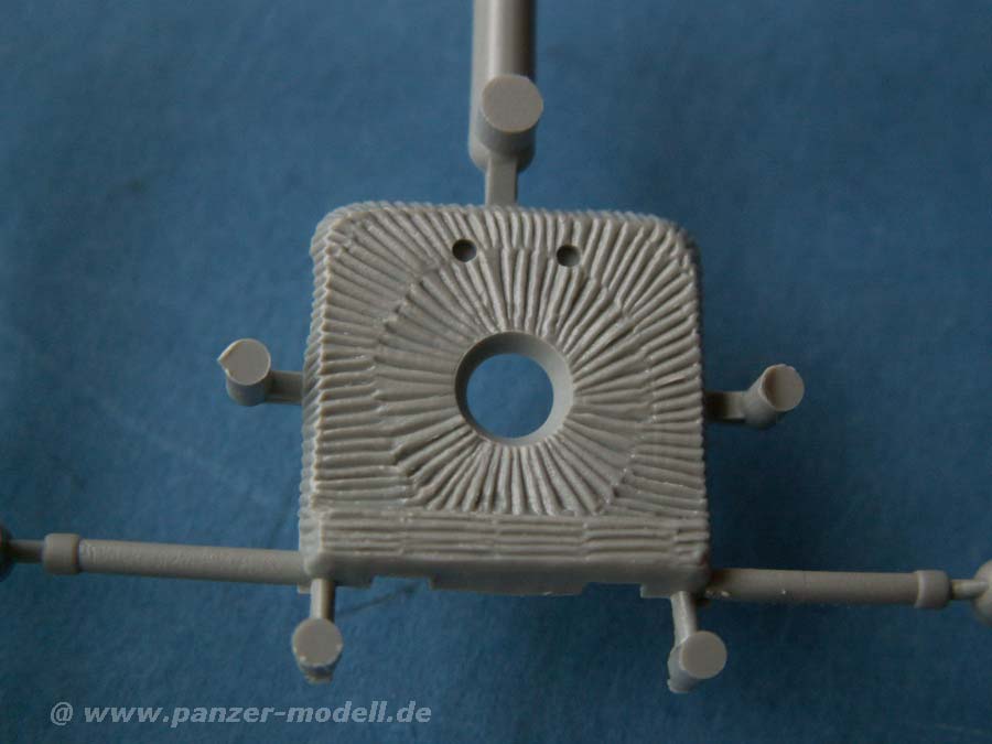 Alle Flächen und Kleinteile, die Zimmerit tragen sollen, liegen dem Bausatz bei, wie z.B. die Kanonenblende, die MG-Blende der Glacisplatte oder die Heckklappe am Turm, die sogar in zwei verschiedenen Varianten des Zimmeritmusters enthalten ist.