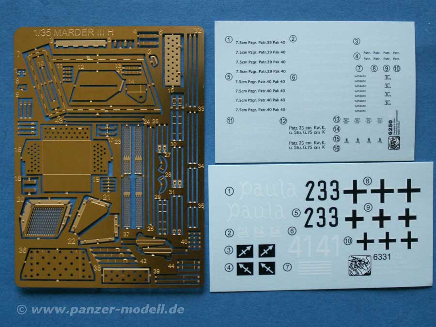 Die Decals bestehen aus 2 Bögen mit Beschriftungen für die Munition und die Verpackungen, sowie Markierungen für den Marder.