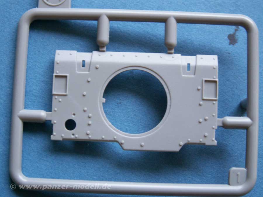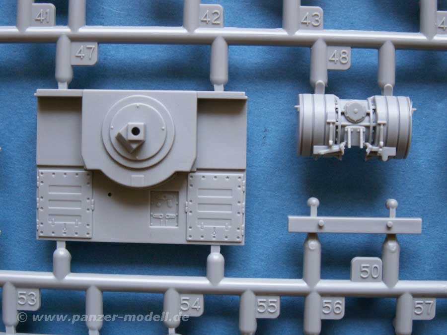 Die Teile an den Spritzlingen machen einen sehr guten Eindruck, die Einzelgliedketten ebenso, die man ja schon vom Aufklärungspanzer 38(t) kennt. Die Details sind exzellent und fein dargestellt. Die Unterwanne ist schön in einem Stück gemacht und ohne Verzug. Desweiteren ist die bereits erhältliche und bekannte 7,5cm PaK enthalten und eine komplette Innenausstattung der Wanne. Allerdings fhlen Instrumente und Pedale für den Fahrer, was aber nicht so dramatisch ist. Besonders gut wirken das Getriebe und der Antrieb - die Details sind wirklich fein und perfekt. Dafür weist die Motorraumtrennwand ein paar Details auf, die für diesen Marder nicht ganz korrekt sind - sehen tut man es vermutlich im fertigen Modell kaum.