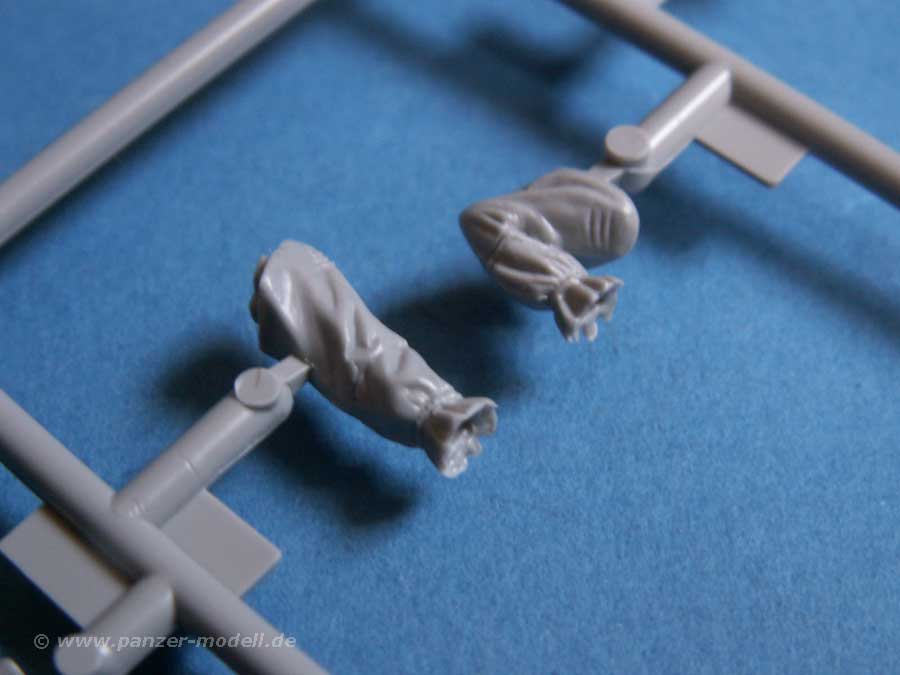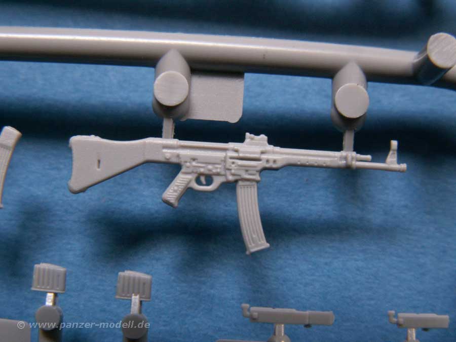 Die Figuren tragen verschiedene Uniformen und Kopfbedeckungen, wobei eine Figur ohne Kopfbedeckung, dafür mit einem Kopfverband(!) versehen ist. Desweiteren gibt es eine Munitionskiste für die Panzerfaust und den bereits angesprochenen Decalbogen für verschiedene Beschriftungen, hauptsächlich für die Panzerfaust. Wer mal die Lupe zur Hand nimmt, wird aber sehen, dass die ganz kleinen Schriftzeilen für die Panzerfaust nur so vor Fehlern strotzen ... allerdings kann dies mit dem unbewaffneten Auge nahezu nicht erkannt werden.