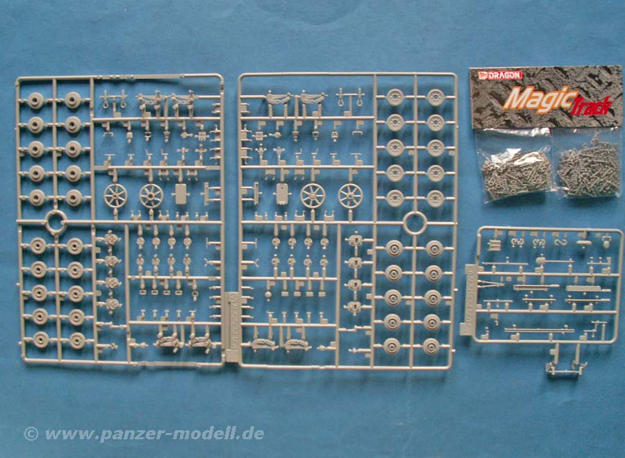 Der Bausatz beinhaltet über 740 Teile an über 16 mehr oder weniger großen Spritzlingen, Turm, Unterwanne, sowie Ätzteile, Klarsichtteile, Einzelgliedketten (Magic Tracks), Metallkabel und einen Decalbogen.
