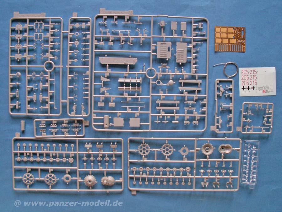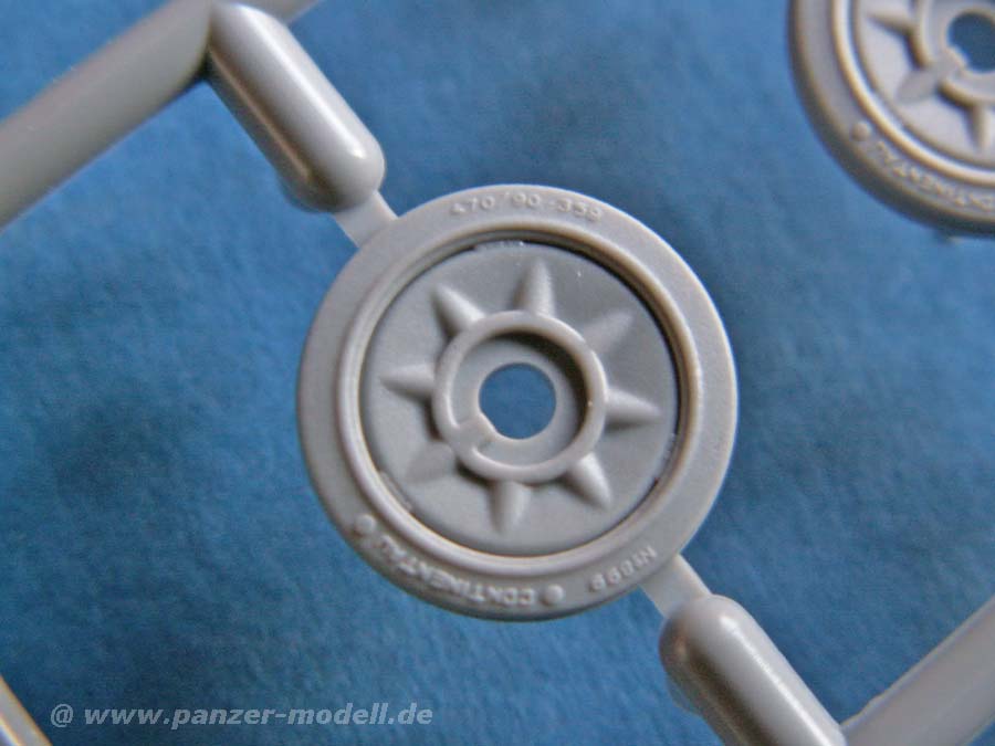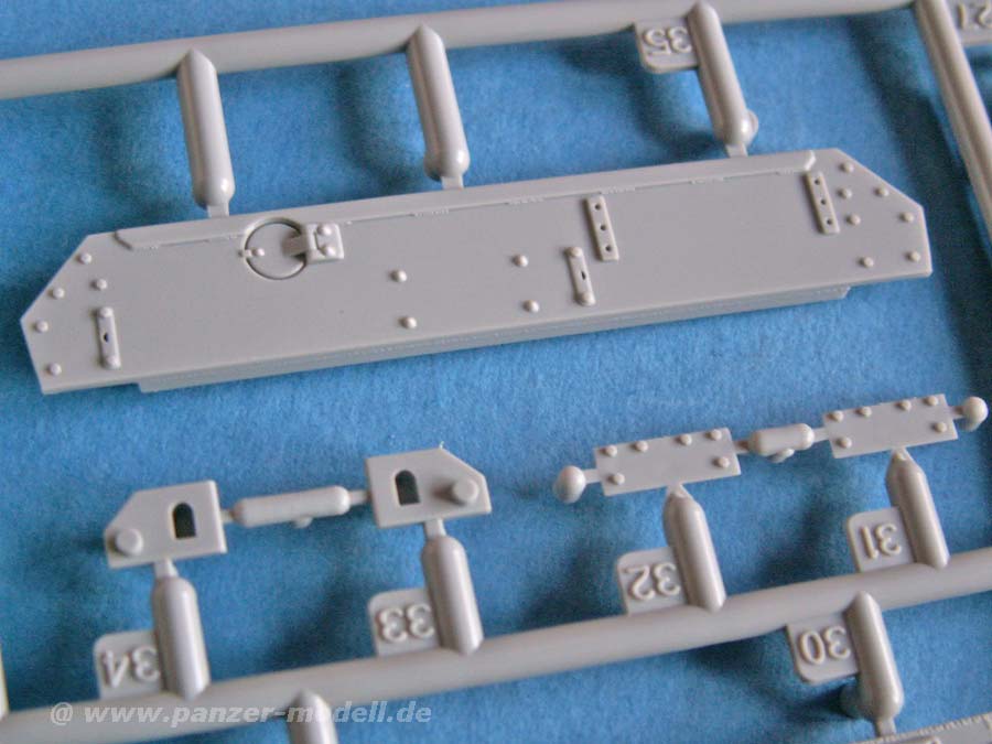 Das Laufwerk ist vom modellbaufreundlichen Typ mit Laufrollen mit bereits angegossenen Laufrollengummis, die widerum mit den Herstelleraufdrucken versehen sind, sowie komplett fertige Blattfederhalterungen.
