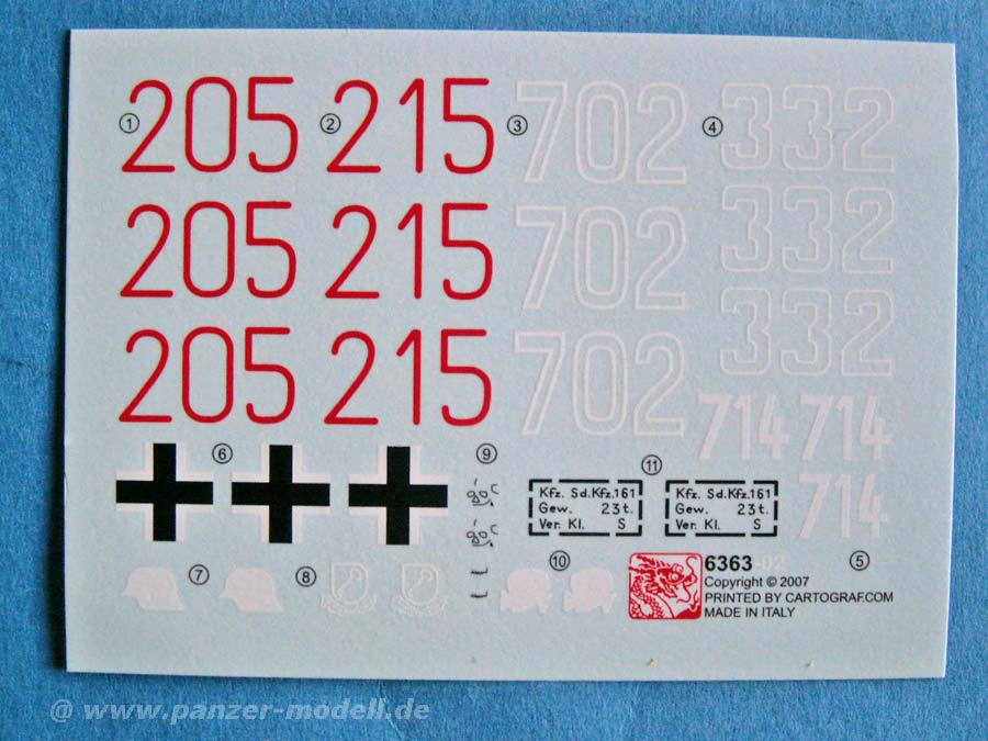 Der Decalbogen und die Bauanleitung ermöglichen die Markierung von 5 Versionen - der Druck ist sauber, aber das Totenkopfsymbol ist quasi unstrukturiert und komplett ausgefüllt. Vermutlich ein Kompromiss für die überbesorgten deutschen Behörden, aber in dieser Form hätte man sich das auch sparen können: