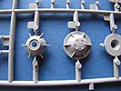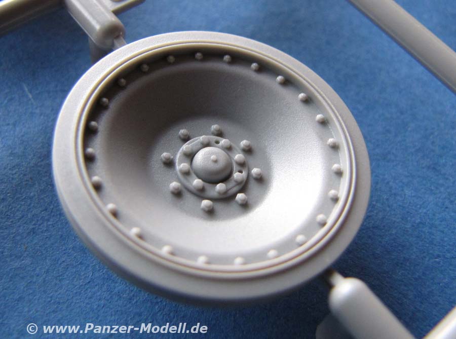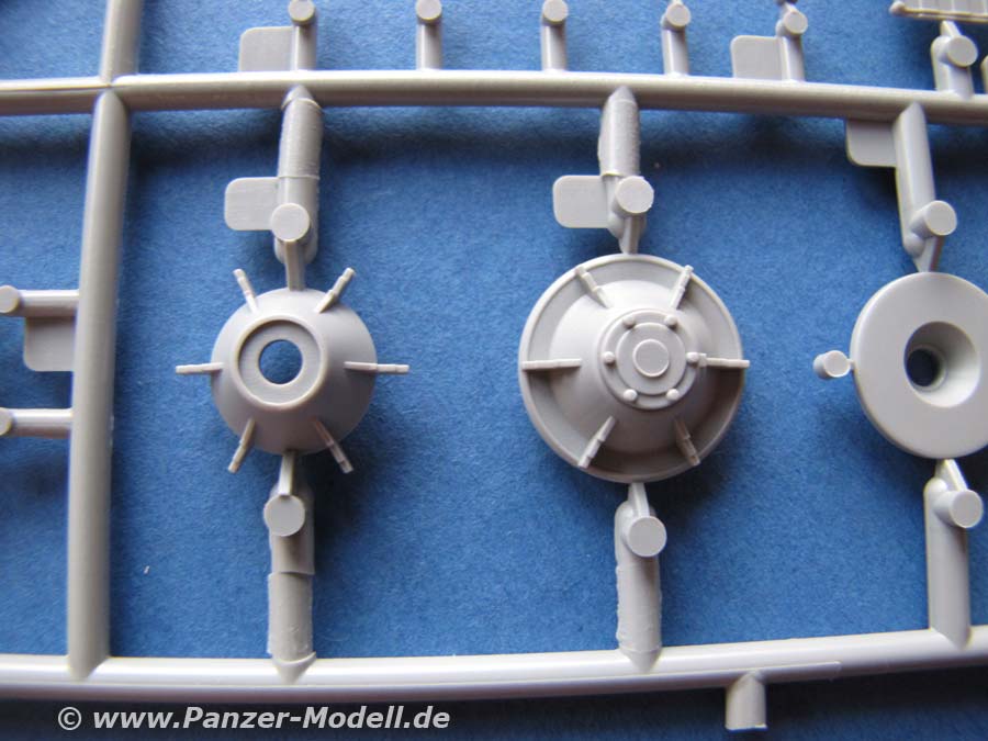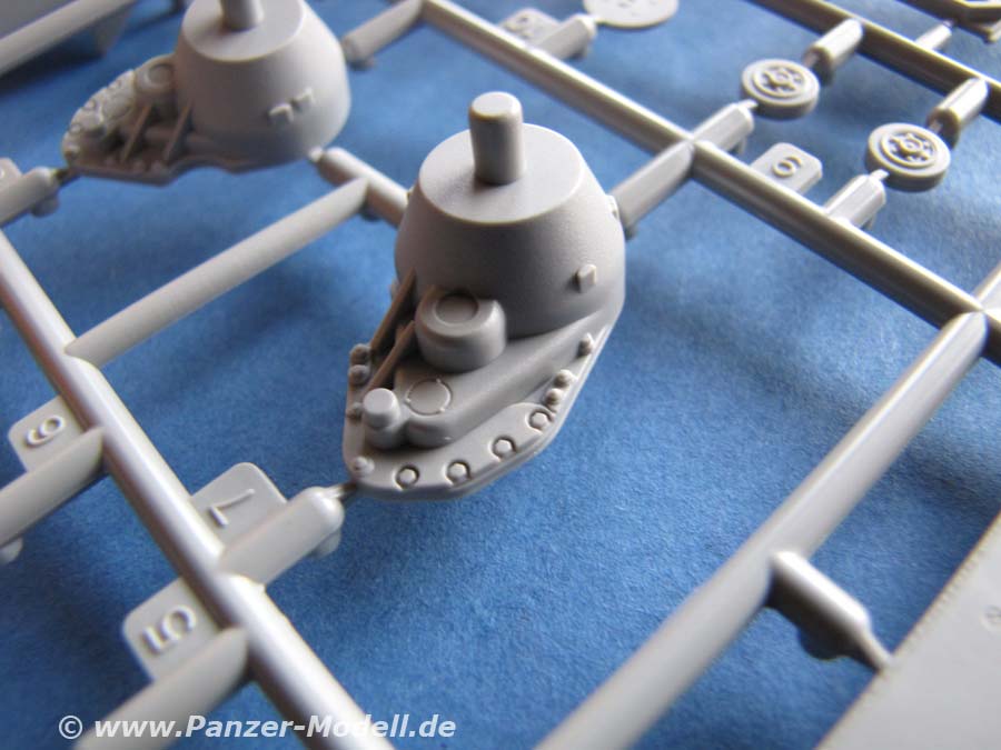 Die Unterwanne mit dem Laufwerk weist zum einen Drehstäbe für den Innenraum auf, wie auch bis ins Feinste detailierte Schwingarme, Anschlagdämpfer und natürlich auch Laufrollen, sowie Treib- und Leiträder. Für einige Schwingarme wie auch Anschlagdämpfer gibt es verschiedene Optionsteile.