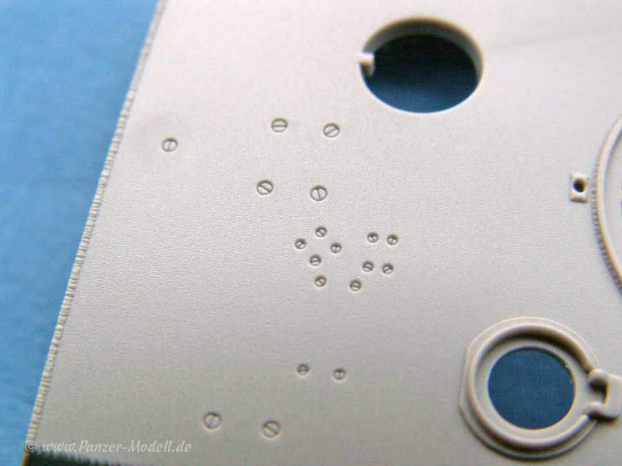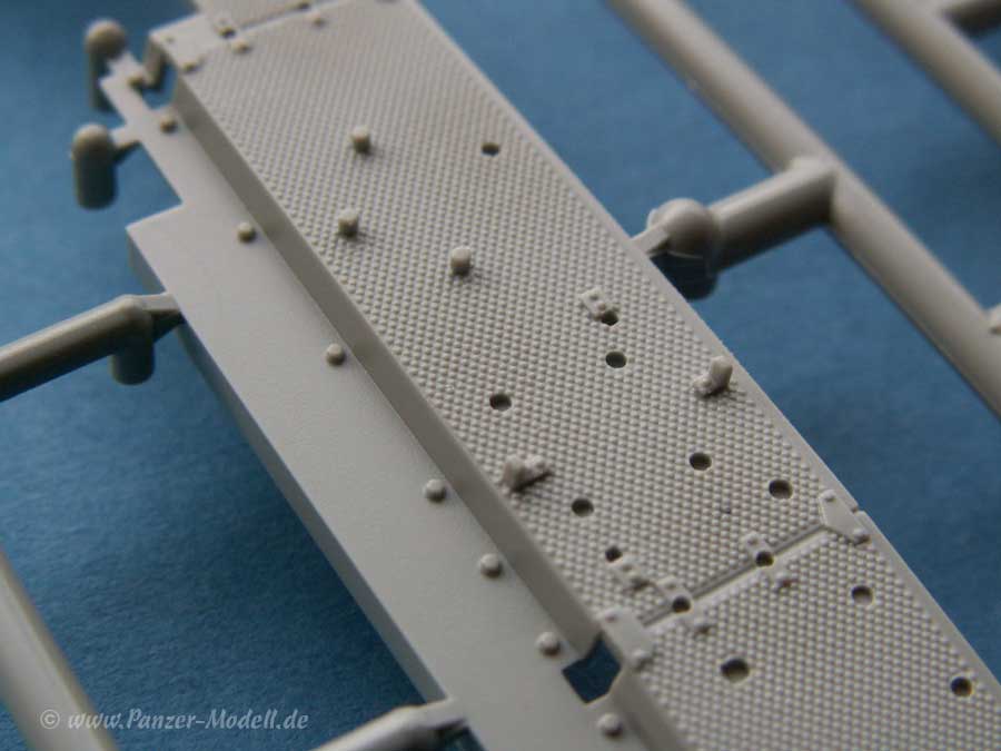 Wie bereits erwähnt sind die Details besonders klasse, so sind z.B. die versenkten Schrauben auf dem Turmdach super dargestellt, oder die feinen Nietenköpfe am Staukasten. Dieser weist zusätzlich sehr detailierte Verschlüsse auf und ist auch offen darstellbar. Auch sämtliche anderen Luken am Panzer sind offen darstellbar, was aber eigentlich nur dann Sinn macht, wenn man Motor- und/oder einen Innenraum einbauen würde. Die Lauf- und Stützrollen sind ebenfalls sehr gut und die Laufrollen mit dem berühmten "CONTINENTAU" Schriftzug versehen, der recht deutlich ausfällt - hier ist es ein leichtes den Letzten Buchstaben so zu modifizieren, dass der Name stimmt. Besonders angenehm fallen die beiden Abschlepseile auf, die bereits fix und fertig mit Halterungen in der richtigen Form für das Motordeck vorliegen - wahlweise kann man die Halterungen aber auch ohne Seil darstellen.