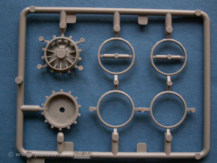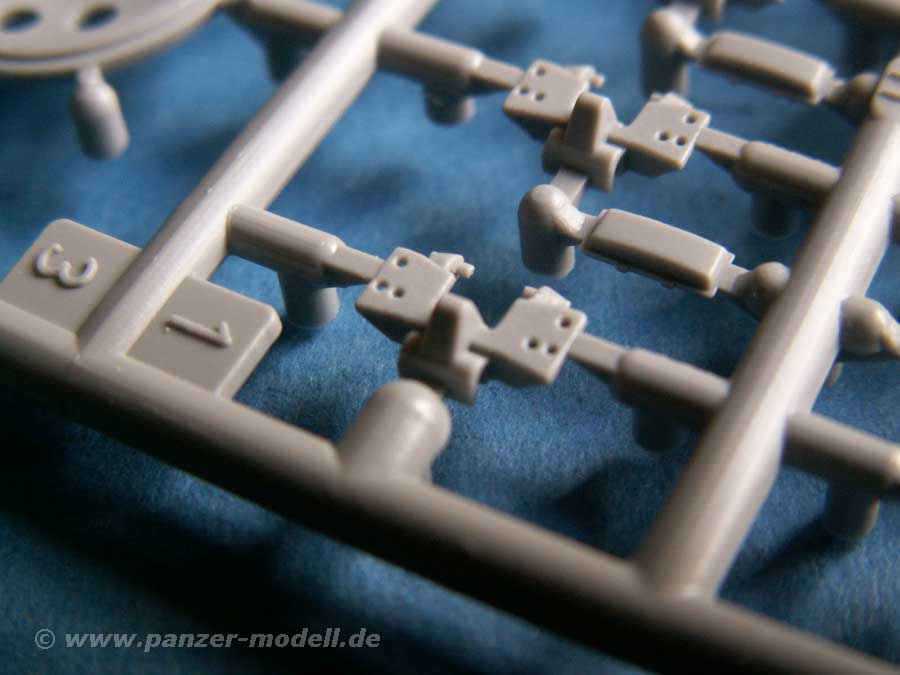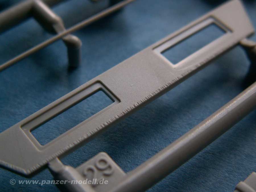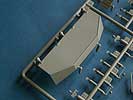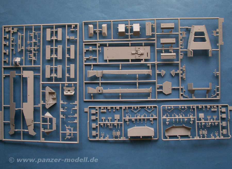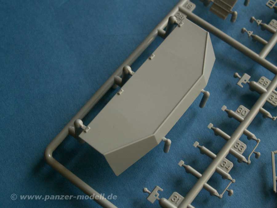 An neuen Teilen finden sich eine neue Bodenplatte, zwei neue Sitze (wahlweise Sitzbänke), das Podest für die Flak, sowie die bereits korrekt ausgeschnittene Ober- und Unterwanne für die beiden Klappteile, was ein Vorteil gegenüber der AFV-Club Version ist, wo man an der Oberwanne noch selber sägen muss.