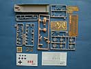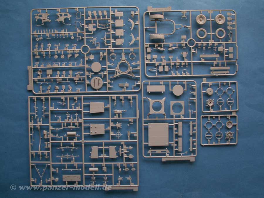 Der Bausatz beinhaltet über 700 Teile an über 18 mehr oder weniger großen Spritzlingen, sowie Ätzteile, Klarsichtteile, Einzelgliedketten, vorgeformte Metallteile für den Hülsenfangkorb und Metallstangen für die Peilstangen, eine Fahrerfigur aus Weichkunststoff und zwei Decalbögen.