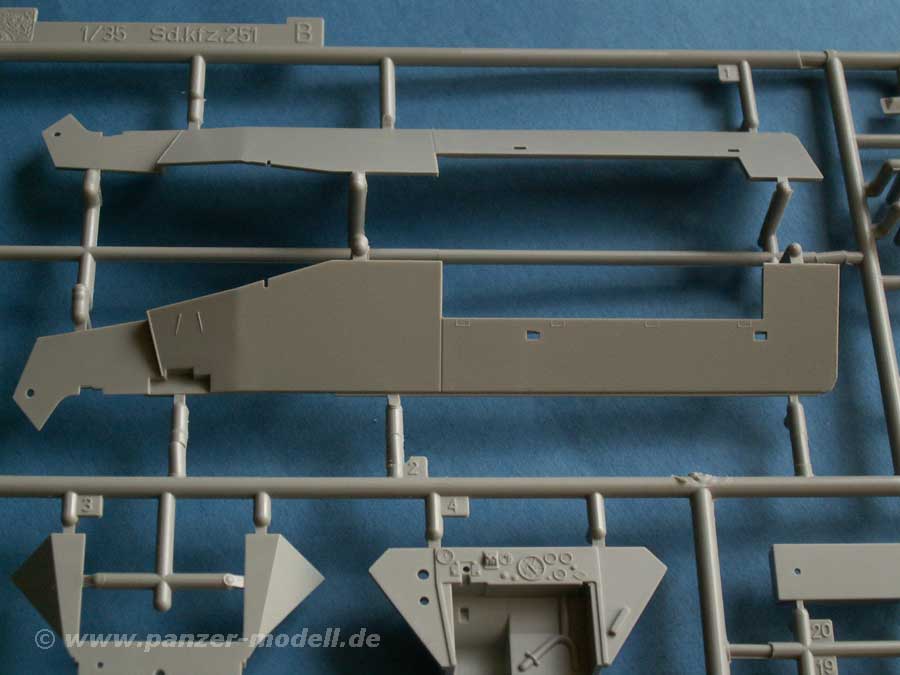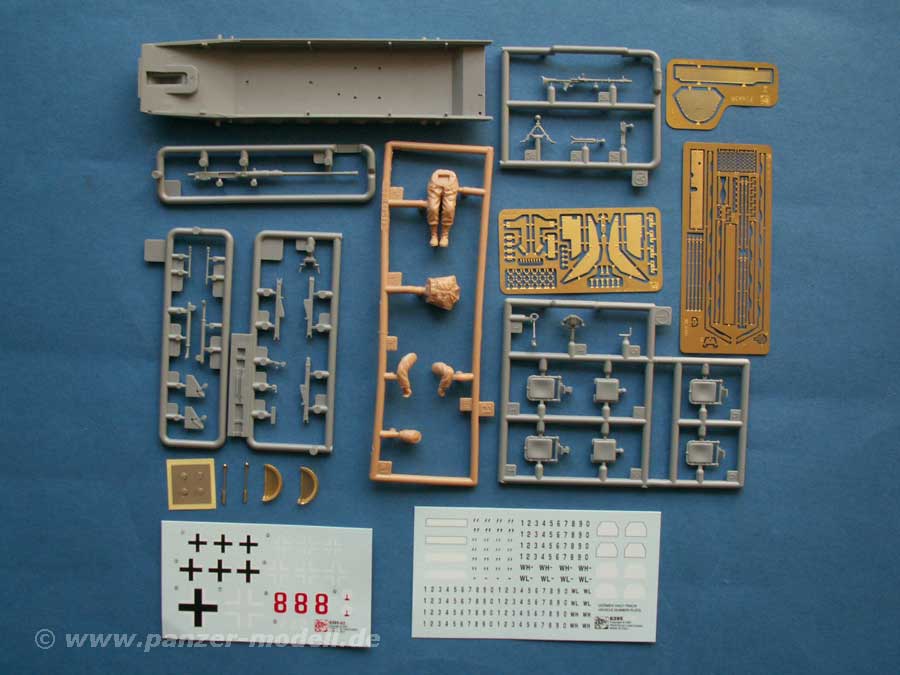 Das Modell ist grundsätzlich auf dem bereits bekannten Sd.Kfz.251/1 Ausf.C aufgebaut, das seine Stärken und Schwächen hat, sowie die ebenfalls bereits bekannte 2cm FlaK38 enthält. Zusätzlich gibt es natürlich die pasenden Teile für die Darstellung dieser Version, sowie einige überarbeitete Teile.