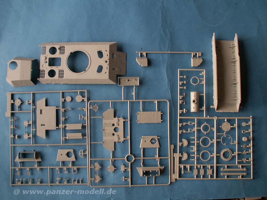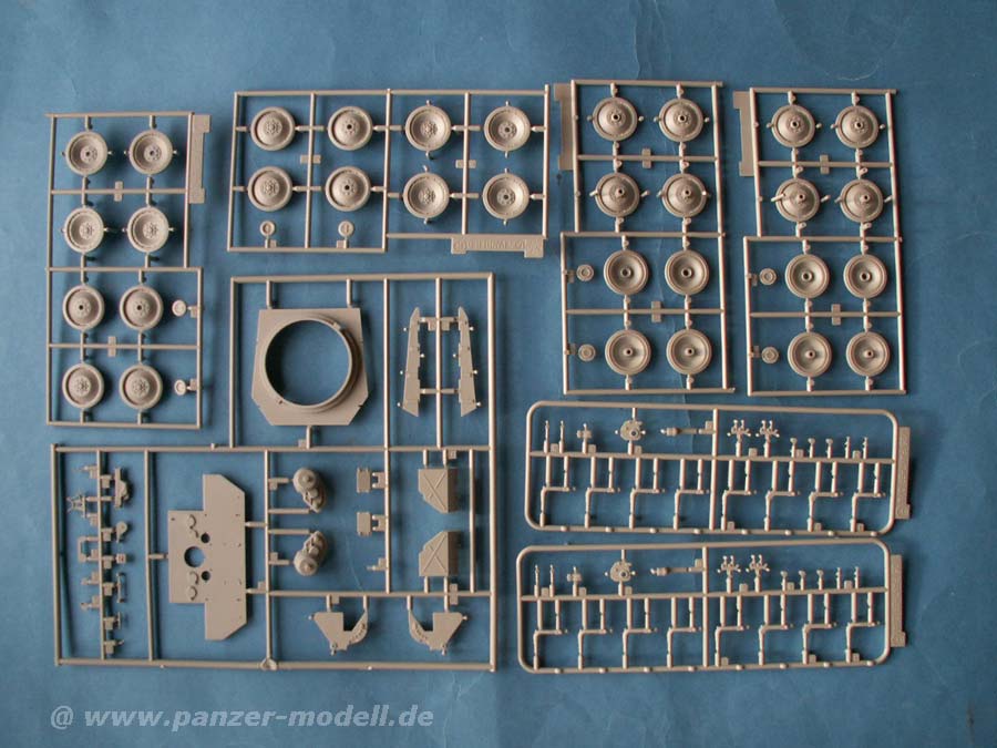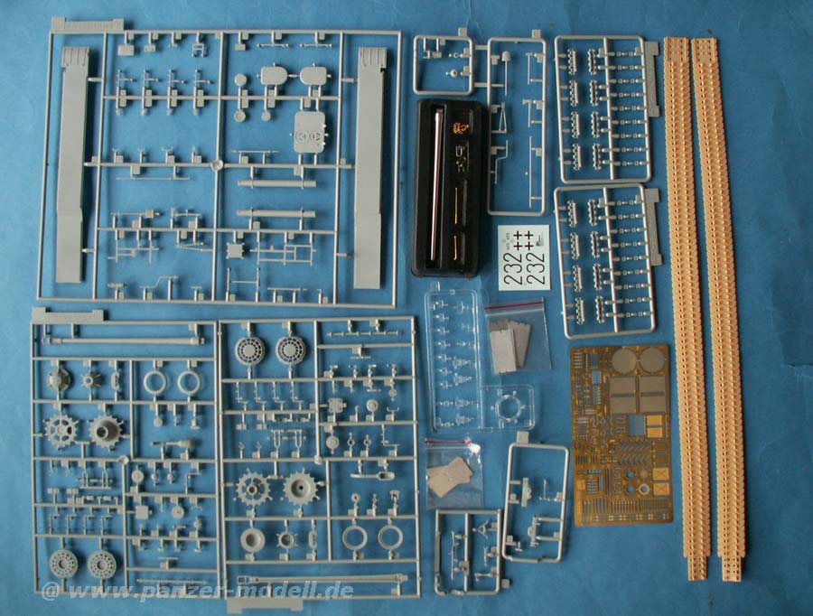 Im Bausatz enthalten sind über 730 Teile an knapp 18 mehr oder weniger großen Spritzlingen. Dazu gibt es die Oberwanne, Unterwanne, Turm, hervorragende DS-Ketten, Fotoätzteile, Klarsichtteile, eine kleine Metallkette, ein Metall-Kanonenrohr, Metallschürzen-Teile, die Peilstangen aus Metall und einen kleinen Decalbogen.