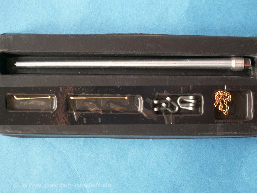 Desweiteren gibt es wieder tolles Werkzeug, Kettenhalter mit Bolzen und Kettchen und 2 Versionen des Unterlegklotzes mit einer speziellen Halterung. Auch die Beigabe dieser speziellen Peilstangen an den Kotflügeln als Metalldrehteile ist sehr gut.