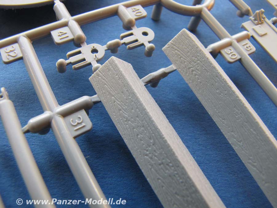 Die Holzabdeckung an sich ist super gemacht mit wudnerschöner Holzstruktur. Allerdings ist diese nicht optional, bzw. mit offener Luke baubar, denn Innenleben für die Panzerwanne ist in diesem bausatz leider nicht enthalten!