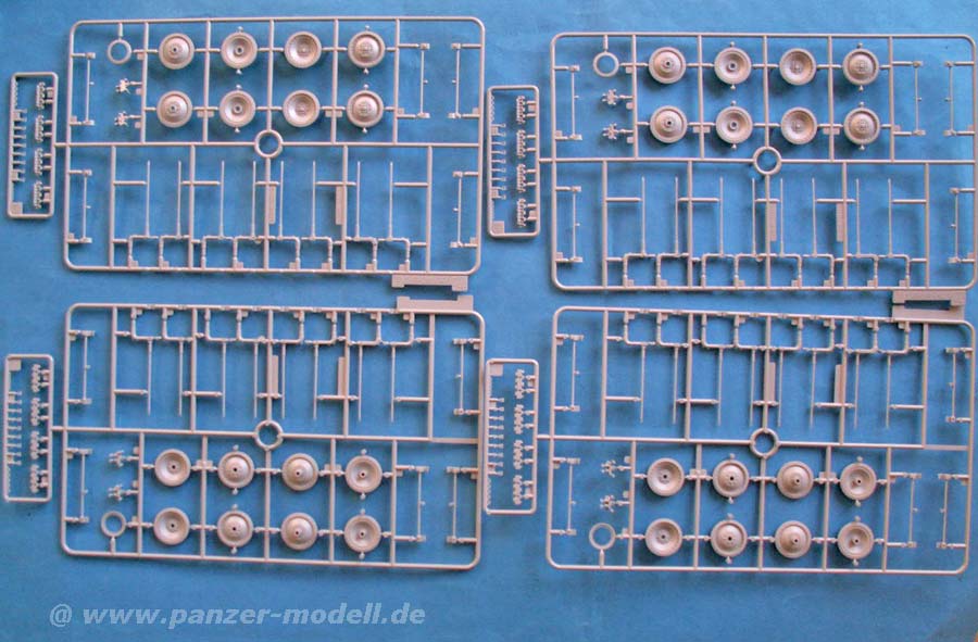 Die Kette ist von den "Magic Tracks", also bereits fertige Einzelkettenglieder in einem Beutel, die man nur noch zusammenstecken und verkleben muss. Schön ist, dass die Auswerferstellen, die oft bei diesen Ketten nerven, recht gering ausfallen und zudem zwischen den beiden (übrigens offenen) Führungszähnen liegen, wo man sie kaum sieht. Eventuelles versäubern verringert sich hier durchaus.