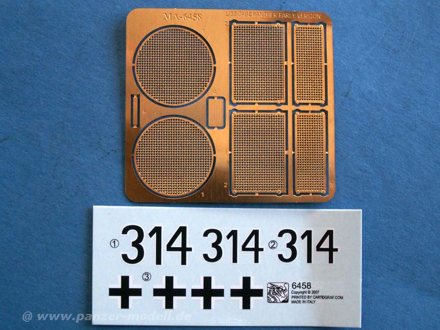 Der Decalbogen ist mal recht mager mit ein paar Balkenkreuzen und der dreifach enthaltenen Markierung "314" - hier wäre vielleicht ein Nummernblock zum eigenen Zusammenstellen schöner gewesen.