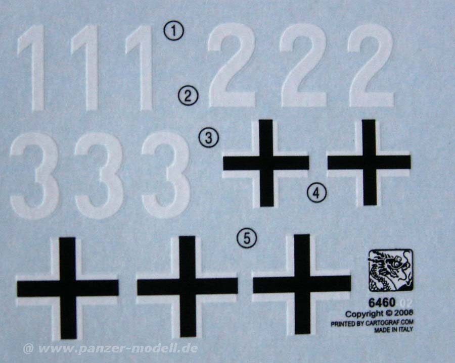 An Markierungen sind nur wenige vorhanden und die Bauanleitung hat 3 Markierungsvorschläge - alle von der Stu.Pz.Abt.216 in Italien 1944. Markiert mit Balkenkreuzen und einer Ziffer von 1-3. Das Tarnmuster ist jeweils gleich - mal mit mal ohne Schürzen und braune Tarnstreifen auf sandgelb.