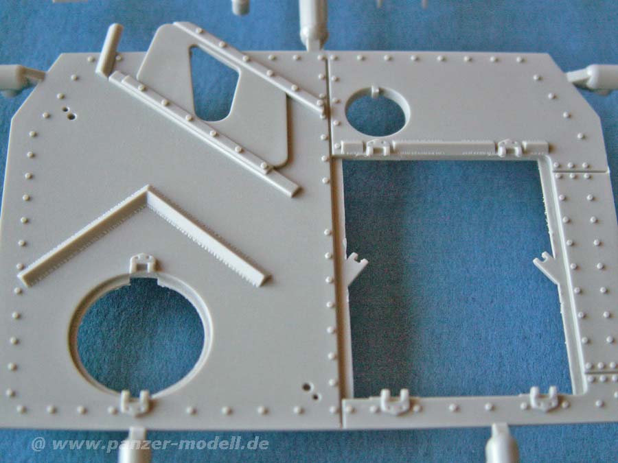 Einer der größten Pluspunkte dieses Bausatzes ist die Tatsache, dass der mehrseitige Aufbau in einem Stück gegossen wurde, wobei nur noch die Deckenplatte und weitere Anbauteile angebracht werden müssen - das ist Dienst am Modellbauer. Und dabei ist die Darstellung der Details phänomenal - gerade die Schweißnähte der verzahnten Panzerplatten an der Front sind genial gemacht. Auch die Pistolenstopfen sind schön gemacht mit feinen PE-Haltekettchen.