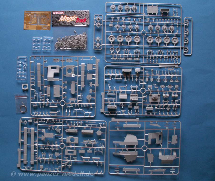 Der Bausatz beinhaltet über 600 Teile an vielen mehr oder weniger großen Spritzlingen, sowie Ätzteile, Klarsichtteile, versäuberte Einzelgliedketten, Metallkabel und zwei Decalbögen.