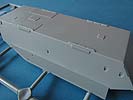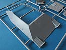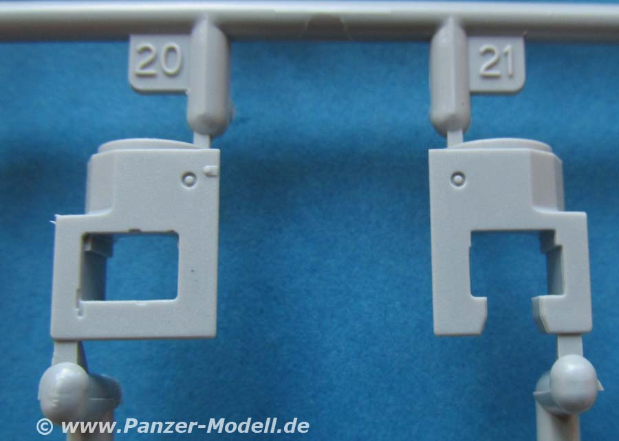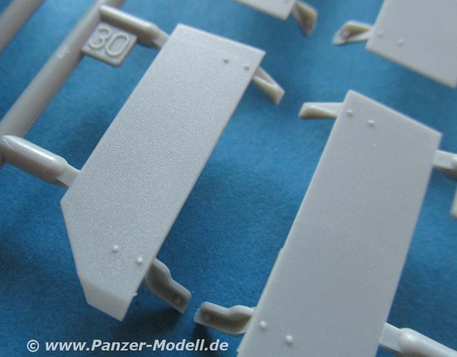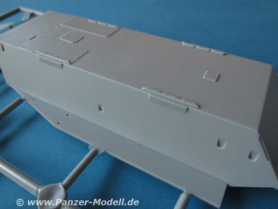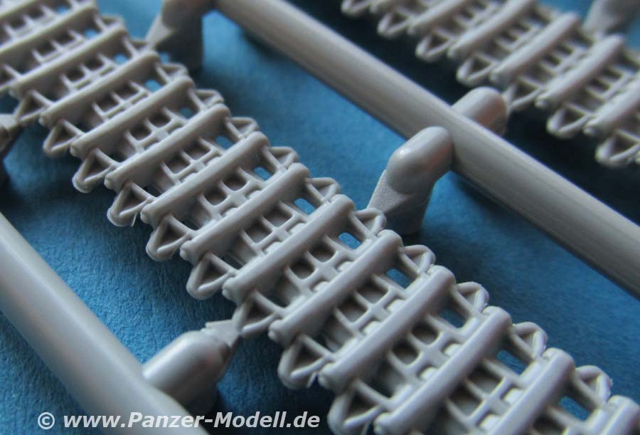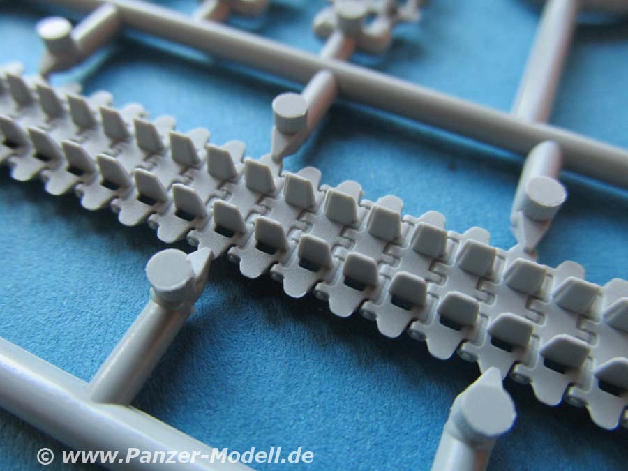 Die Unterwanne ist quasi unverändert die Hetzer Unterwanne mit den Radstationen und Federungselementen, die allerdings nicht beweglich ausgeführt sind. Da die beiliegende Kette eine der neuen "Neo"-Tracks ist, die nichts anderes als Segmentketten mit einzelnen Gliedern für die Umläufe um Treib- und Leitrad sind, muss das Laufwerk aber auch nicht beweglich sein. Ganz ansprechend und detailliert auf der Aussenseite, eher so mittelmäÃig auf der Innenseite und dazu mit einigen nicht ganz einfach abzutrennenden Angüssen.