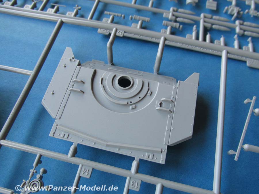 Die Aufbauteile des Kampfraums macht einen exzellenten Eindruck mit schönen dünnen Wänden und einer Menge Details wie Munhalterungen, Staubocen und Waffenhalterungen. Zusätzlich liegen auch noch einige passende Granaten in Plastik bei.