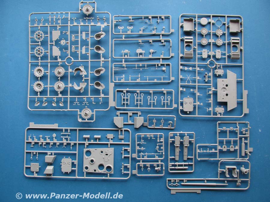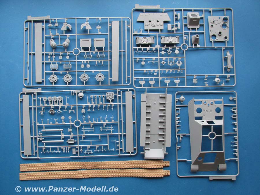 Im Bausatz enthalten sind über 420 Teile an 20 mehr oder weniger großen Spritzlingen, dazu ein Spritzling mit Klarsichtteilen, Unterwanne, zwei DS Ketten, zwei radteile, eine PE Platine und ein kleiner Decalbogen.
