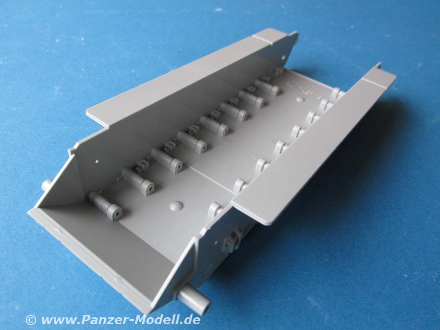 Die Oberwanne mit Motordeck entspricht auch der korrekten G2 Auslegung, unter anderem mit der Kampfraumheizung. Auch zwei Lüfterabdeckungstypen zur auswahl sind auch dabei, wie natürlich die Abdeckgitter aus fein geätzten PE Teilen. Unter dem Motordeck finden sich auch die Teile für das Innenleben von Kühlern und Lüftern.